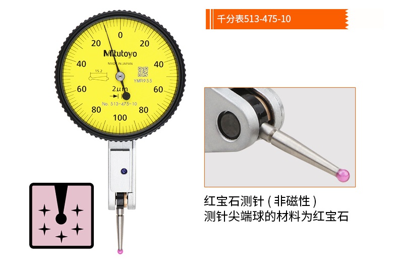 日本MITUTOYO三豐杠桿千分表513-475-10E紅寶石測針比硬質合金具有數倍的抗磨損性,因為是不導電素材,可以在電火花機上安全使用。......